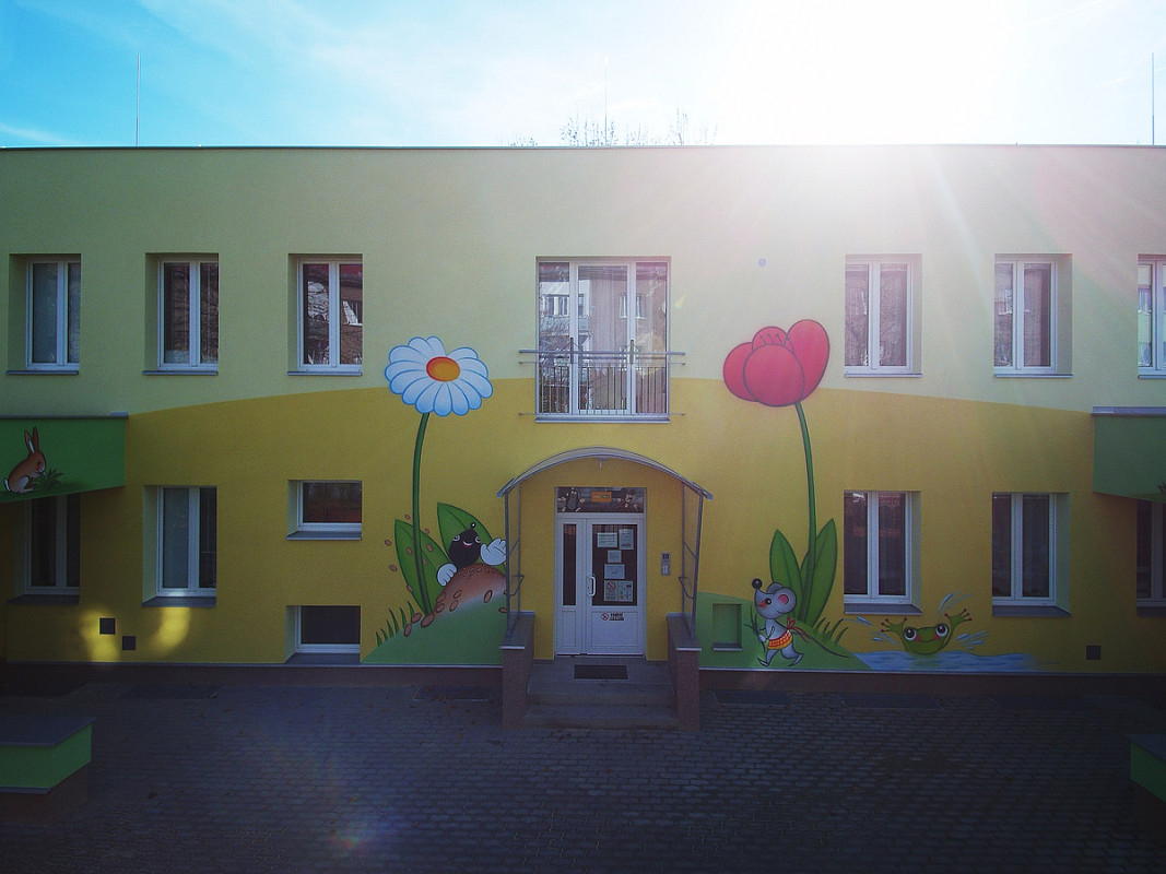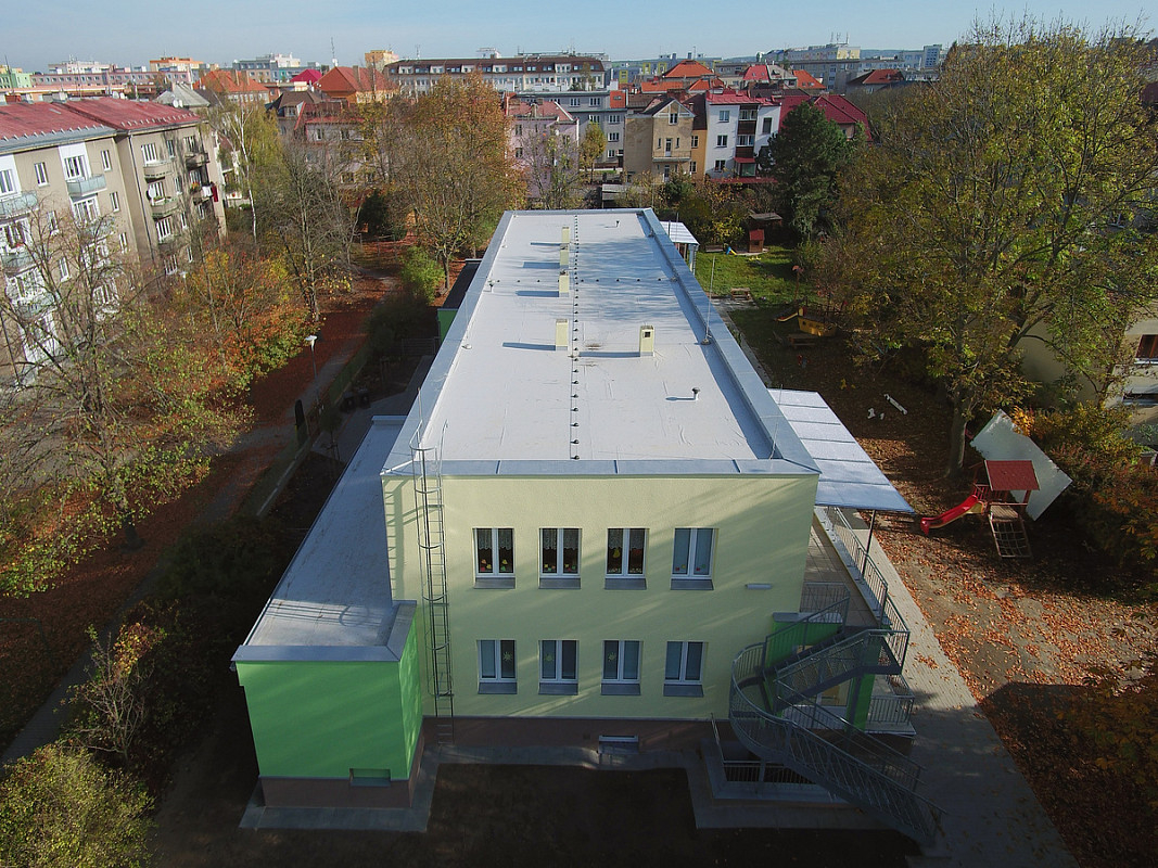 Zateplení fasády a střešního pláště budovy 51. mateřské školy v Plzni, ulice Částkova. Sanace suterénu. Realizace 2019.