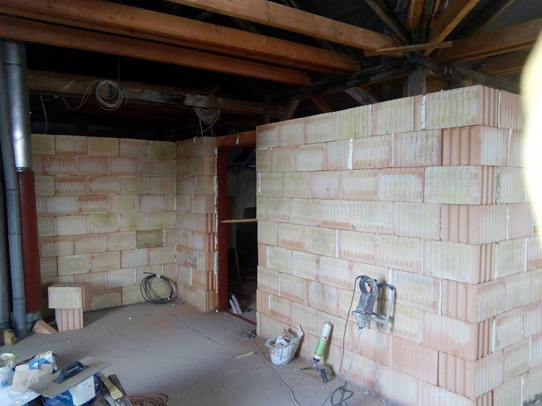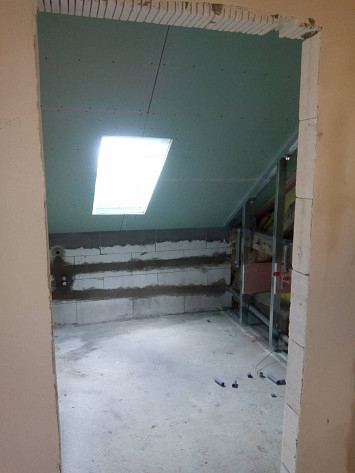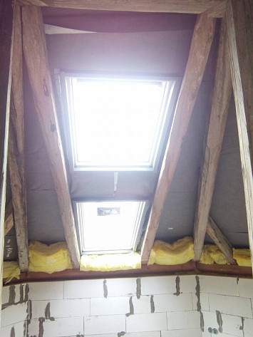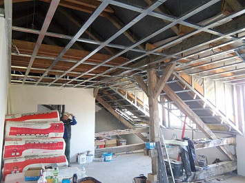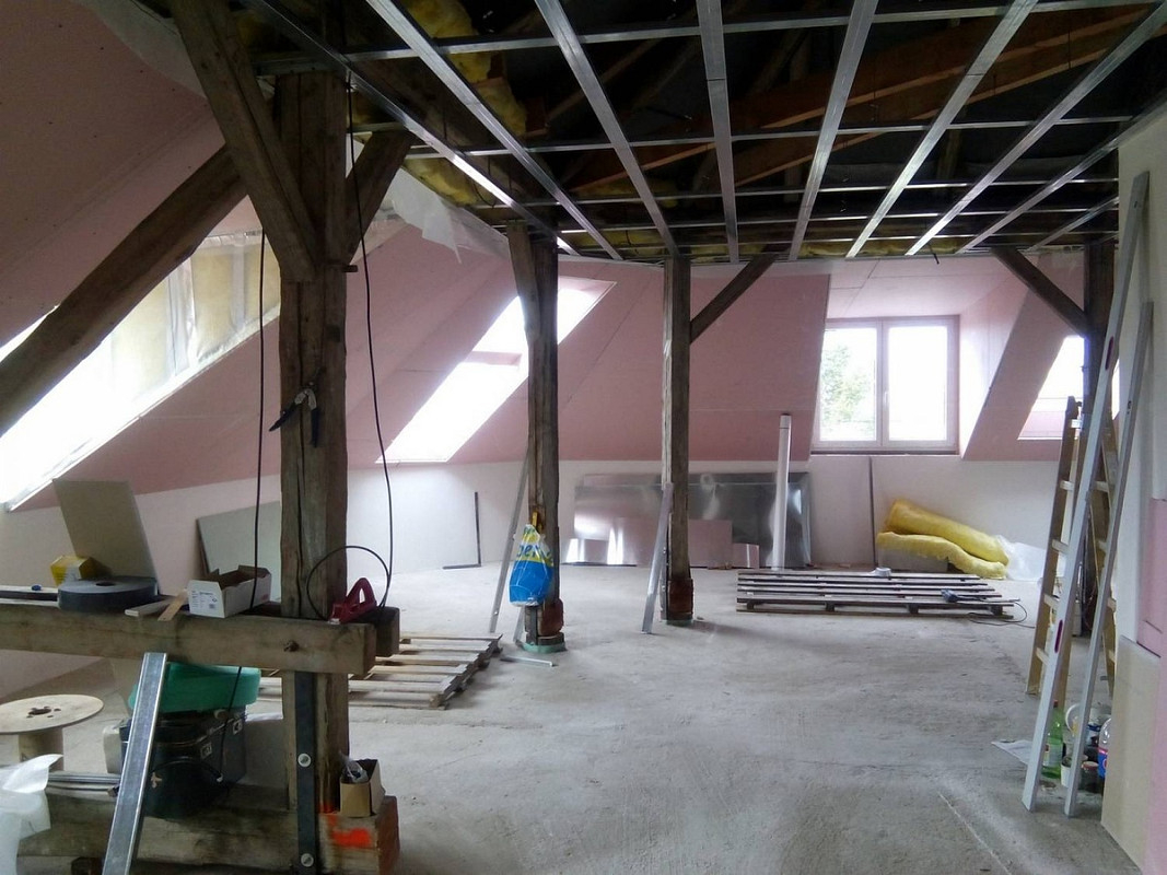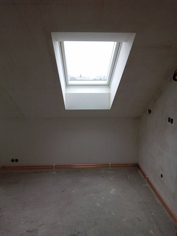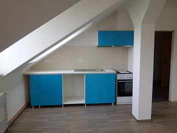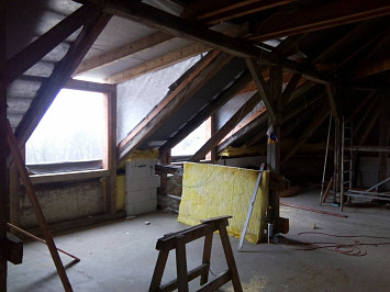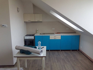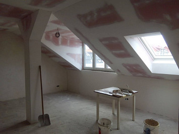Půdní vestavba čtyř bytových jednotek na klíč v objektu Živnostenská 21, Plzeň. Kompletní realizace bytů včetně rozvodů a vybavení, 2015.